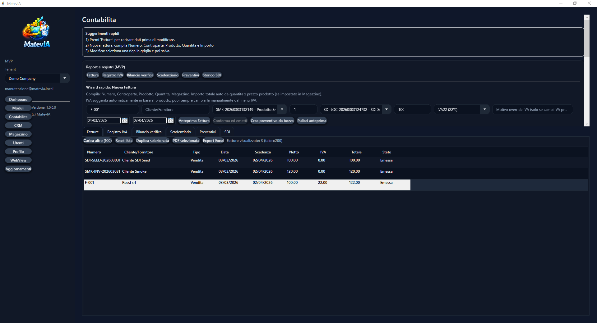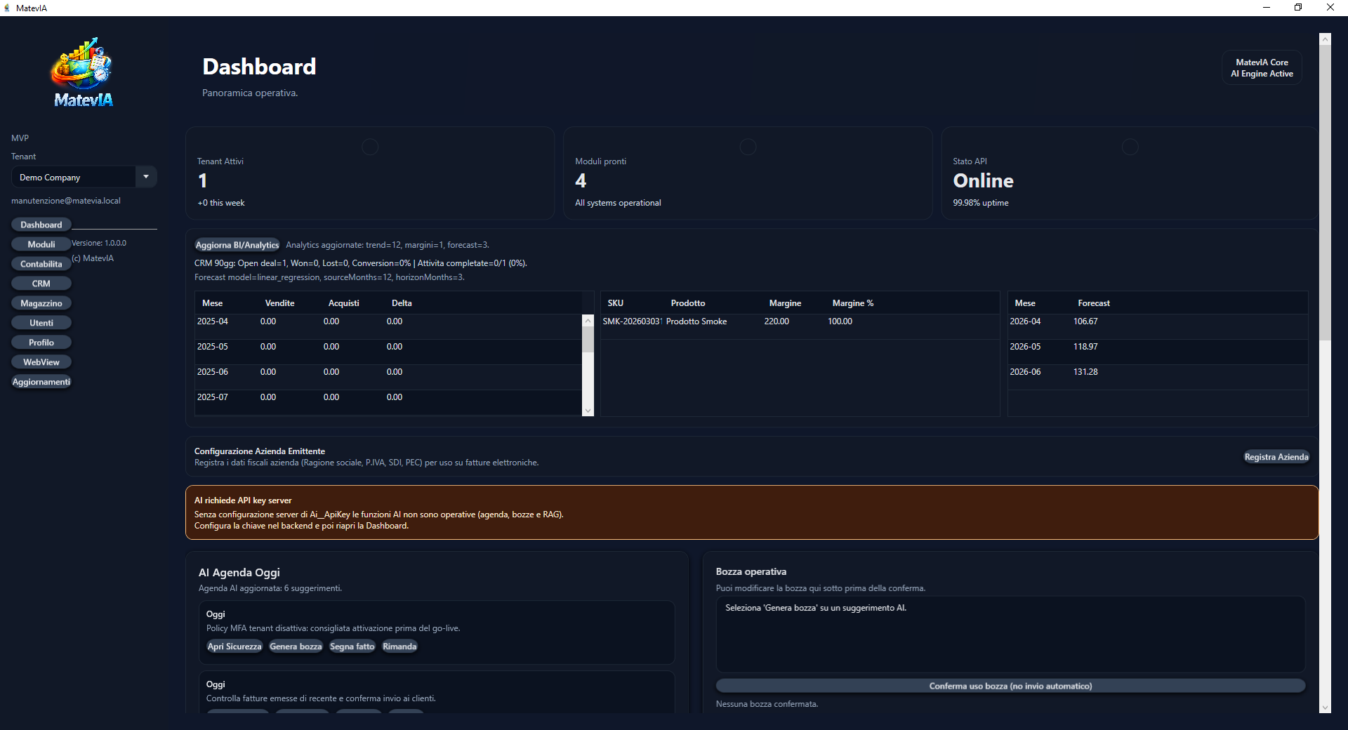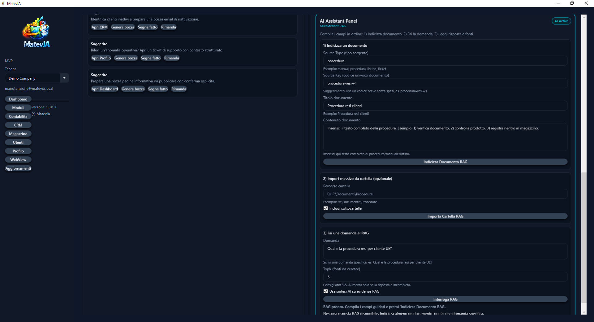 Contabilità, Magazzino e CRM in un’unica piattaforma — con assistente AI governato (preview + conferma), RAG documentale e tooling operativo pronto (demo, backup, monitoring).